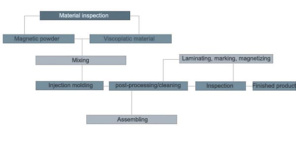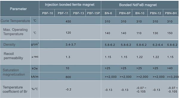 - Molded by mixing ferrite or rare-earth magnet powder with thermoplastic materials, and using injection compression method