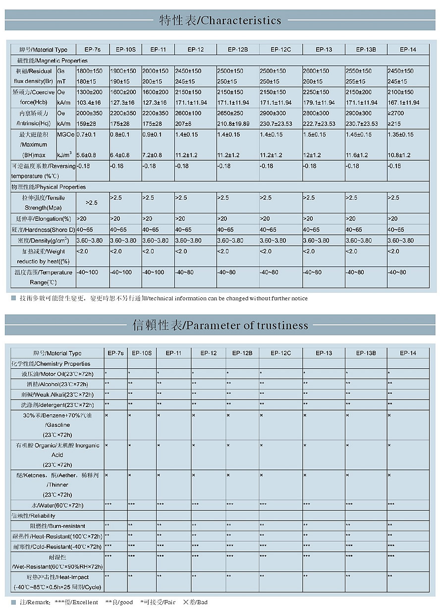 橡胶磁铁材料本身可塑性高,成品可曲挠性好,可以制备任意形状复杂、薄壁型的产品;一致性好,尺寸精度高;耐冲击震动性能好,不易碎;磁体的比重小,有利于器件、整机的轻量化;可以制造成全径向(全辐射)取向的磁体;可以裱贴PVC、PP合成纸、双面胶等,制作成各种各样的制品。